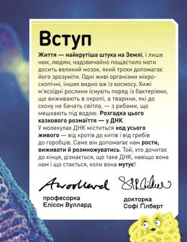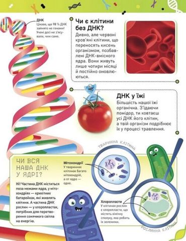 У виданні яскраво подано цікаві факти про дивовижну молекулу ДНК і гени, які є ключами всього життя — від кита до дрібної амебки. Чому в нас різний колір очей, чи можна «оживити» мамонтів, чому ми схожі на батьків, як з’явилось стільки порід собак, що таке генна інженерія? І це далеко не все! Книжка розповість про роль ДНК навіть у криміналістиці! Веселі і дотепні ілюстрації, чіткі і зрозумілі схеми і захопливі фото зроблять оповідь про таємничу молекулу неймовірно цікавою і дітям, і їхнім батькам.