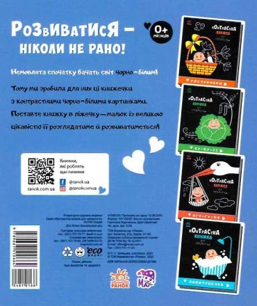 Від 0 місяців Розвиватися — ніколи не рано! Немовлята спочатку бачать світ чорно-білим! Тому ми зробили для них ці книжечки з контрастними чорно-білими картинками. Поставте книжку в ліжечку — малюк із великою цікавістю її розглядатиме й водночас розвиватиметься!