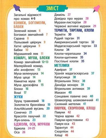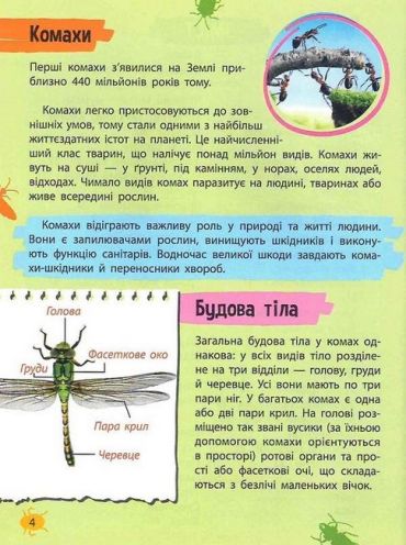 Дитяча мініенциклопедія про комах і павукоподібних — чудова книжка для всіх, хто хоче поринути в загадковий світ цих істот. Юні читачі дізнаються чимало фактів про спосіб життя метеликів і жуків, мурах і бджіл, павуків і скорпіонів. Яскраві фотографії дозволять розглянути навіть найдрібніші особливості будови цих маленьких, але дуже цікавих створінь природи.