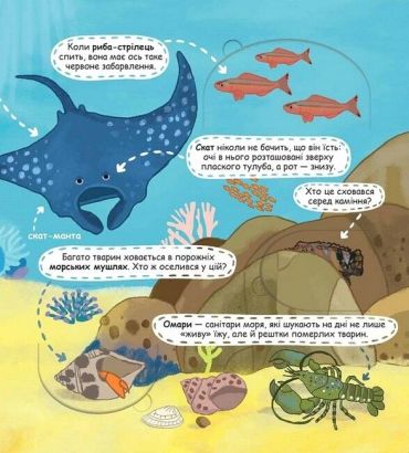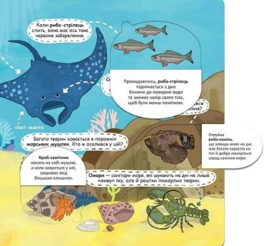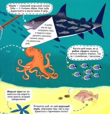 Ця книжка є справжньою енциклопедією у життя морських тварин. Знайдіть усі віконця, відкрийте їх і з’ясуйте, хто заховався за високим каменем, а хто зарився у піщаний ґрунт; де побудував гніздо морський крокодил; чи страшні «монстри», що живуть на самісінькій глибині… Досліджуйте дивовижний світ морів та океанів і дізнавайтеся неймовірні факти про життя його численних мешканців.
