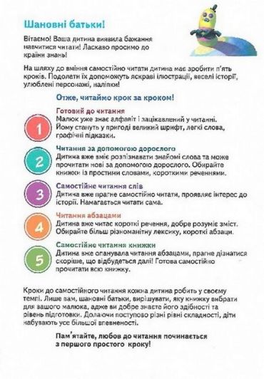 На шляху до вміння самостійно читати дитина має зробити п’ять кроків. Подолати їх допоможуть яскраві ілюстрації, веселі історії, улюблені персонажі! Кроки до самостійного читання кожна дитина робить у своєму темпі. Долаючи поступово різні рівні складності, діти набувають усе більшої впевненості.