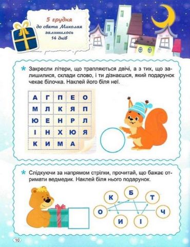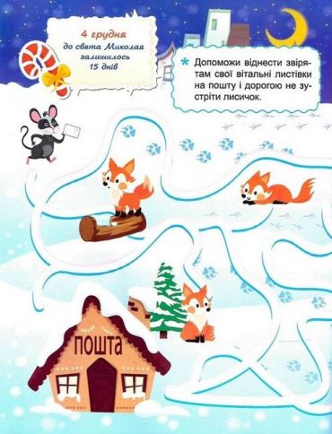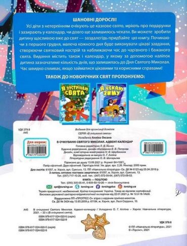 Усі діти з нетерпінням очікують це казкове свято, мріють про подарунки і зазирають у календар, чи довго ще залишилось чекати. Ви можете вже до свят зробити дитину щасливою - заздалегідь придбайте цю книгу. Починаючи з першого грудня, малеча кожного дня буде виконувати цікаві завдання, створюючи святковий настрій та наближаючи час до чарівного і бажаного свята. Видання містить також і календар, у якому за допомогою наліпок дитина зазначатиме кількість днів, що залишилась до Дня Святого Миколая. Час дуже швидко спливає, якщо займатися цікавими та корисними справами!