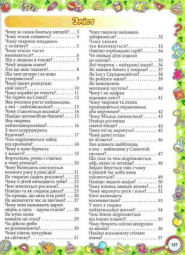 Саме у ракурсі дитячого сприйняття світу зібрані всі статті цієї енциклопедії. Із її допомогою дорослі із легкістю пояснять наприклад таке: «Яка різниця між алігаторами та крокодилами?», «Звідки морський коник дістав свою назву?», «Чому ми народжуємося без зубів?», «Навіщо оленям роги?», «Як виникають хвилі?», «Як вітрильник йде проти вітру?», «Чому риби не тонуть?» та багато-багато іншого.