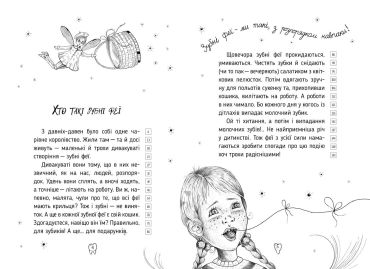 «Оповідки зубної феї» — це короткі, але дуже цікаві історії від найталановитішої в світі чарівниці! Наприкінці кожної історії — запитання, відповівши на які, ти отримаєш від мами (чи того, хто вчить тебе читати) заслужене #оце–молодець! Числа наприкінці рядочків — це кількість прочитаних тобою слів. Тож дорослі можуть швидко порахувати, скільки слів ти читаєш за хвилину. Кілька спроб — і он як ти вже тарабаниш! І зауваж — ніякої магії! Ну хіба зовсім трішки, адже оповідачка — справжня фея!..