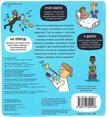 Час знайомити дітей зі світом професій! У книжці «Світ професій» юні читачі зможуть знайти цікаві факти про роботу та заняття у різних галузях. Чим займається інженер на будівельному майданчику? Навіщо лікарі використовують рентген? Чому сценаристам потрібно мати багату уяву? Чим займаються археологи, ботаніки та фотографи-натуралісти? Хто такі криміналісти? Відповіді на ці запитання читачі знайдуть на сторінках цієї книжки. Зрозумілий виклад, яскраві ілюстрації та інтерактивні елементи-віконечка зроблять першу зустріч зі світом різноманітних професій не лише пізнавальною, а й веселою. «Світ професій» — це одинадцята книжка з улюбленої серії «Маленькі дослідники» у видавництві #книголав. Перше видання «Моє дивовижне тіло» стало абсолютним бестселером і поповнило домашні бібліотеки майже 30 000 українців, разом із ним до лідерів увійшли: «Світ тварин», «Динозаври», «Космічний світ», «Підводний світ» та «Транспорт».