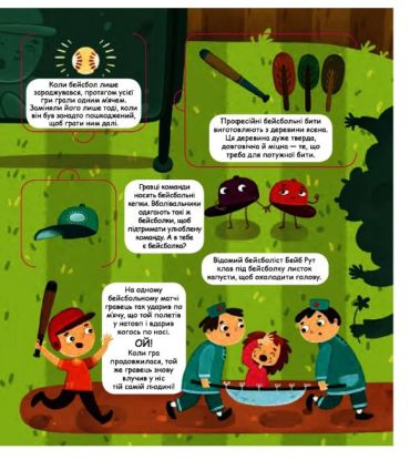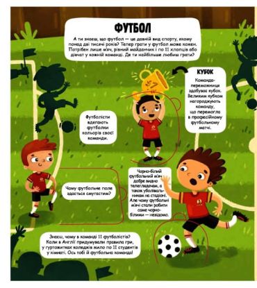 Читачі дізнаються все про футбол, плавання, гімнастику, футбол, теніс, лижі та родео. Який з видів спорту найбезпечніший? В якій країні придумали футбол? Які тварини беруть участь в родео? Ці та інші цікаві факти чекають на вас у цій яскравій книжці!