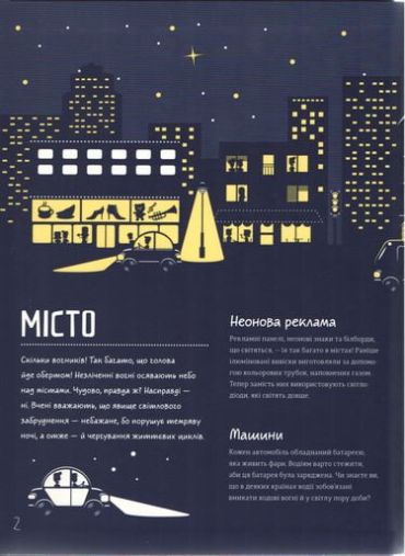 Розгорни цю книжку і досліджуй місто вночі. Що це там світиться у темряві? Чи знаєш, як освітлювали домівки колись давно? Поглянь на всі ці вуличні ліхтарі та величезні рекламні білборди у місті — їхнє світло таке ясне і потужне, що підсвічує нічне небо. Явище, коли в атмосферу розсіюється штучне світло, має особливу назву. Прочитай цю книжку і дізнайся, про що йдеться. А коли вимкнеш світло, книжка світитиметься у темряві!