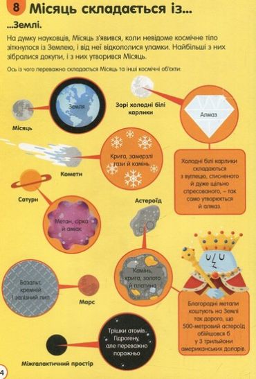Авторів книжки «100 фактів про космос» можна сміливо називати популяризаторами науки, адже після її прочитання жодна дитина більше не повірить тому, що «Сонечко лягає спати», а зірки можуть падати з неба. Весела, дотепна та дуже змістовна ця книжка подає відомості про історію вивчення космосу, розташування у Всесвіті Землі, утворення Сонячної системи, дослідження планет роботами тощо. Оперуючи цифрами, використовуючи зрозумілі приклади, «100 фактів про космос» пояснює, що таке гравітація, розповідає про злиття галактик, магнітні бурі та інші явища. Книжка містить цікавинки, про які не дізнаєшся навіть у школі. Скільки сміття на Місяці залишила команда «Аполона-11» після висадки на нього? З чого розпочати колонізацію Марса? Скільки жінок і чоловіків брали участь в польотах за межі Землі? Що робили в космосі плодові мушки й тихоходи? «100 фактів про космос» дивуватимуть як юних читачів, так і їхніх батьків.
