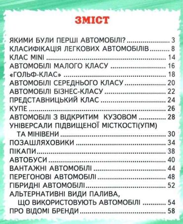 Ця книжка розповість юним читачам про автомобілі: про історію їх створення і перші автомобілі, про сучасні легкові автомобілі, автобуси і вантажівки, про їх класифікацію і основні характеристики.
