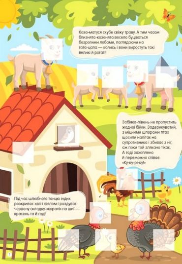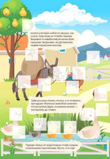 Хто є предком усіх собак, навіщо коням підкови, у яких тварин ноги-весла… Книжка розповість чимало цікавого про мешканців ферми, стане чудовим помічником для знайомства дитини з навколишнім світом і розвитку мовлення. А щоб читати було ще цікавіше, запропонуйте дитині самостійно доповнити зображення наліпками та розповісти історії про свійських тварин.