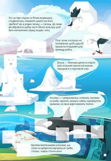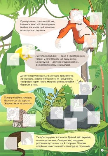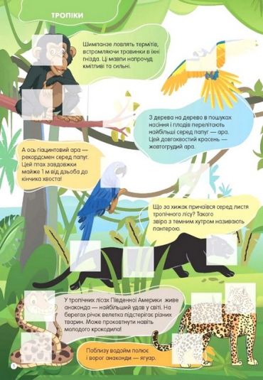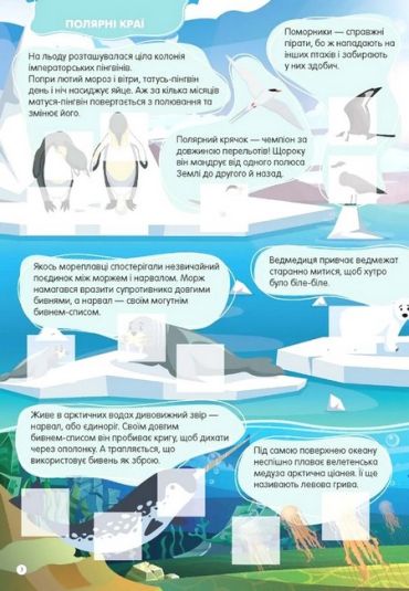 Морський коник — досконалий майстер маскування. Нумо шукати його серед водоростей! А які дивовижні тварини ще живуть у морях та океанах? Чи правда, що в Арктиці мешкає єдиноріг, а в тропіках є звір у лицарських обладунках? Доповнивши наліпками зображення в цій книжці, дитина зможе створити власну прецікаву енциклопедію диких тварин.