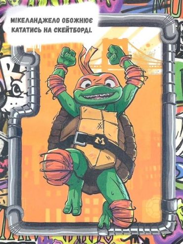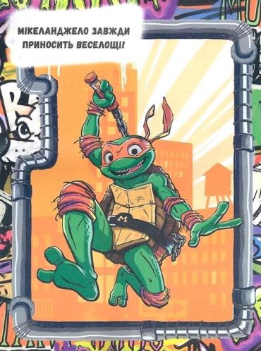 Вони спритні та відважні, вони б'ються з негідниками і рятують місто. Вони завжди прийдуть на допомогу тим, хто у біді. Це команда черепашок-ніндзя на чолі з сенсеєм Сплінтером. На сторінках цієї книжки ти зможеш розфарбувати своїх улюблених героїв!