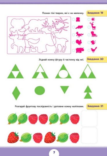 Із книжкою «Логічне мислення» дитина повправляється шукати спільне й відмінне між предметами, доповнювати логічні послідовності та розгадувати судоку, зіставляти предмети з їхніми тінями й віддзеркаленнями; орієнтуватися в просторі, визначаючи зображення фігур збоку й згори, а також доповнюватиме малюнки й малюватиме фігури й візерунки по клітинках.