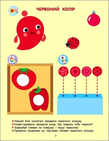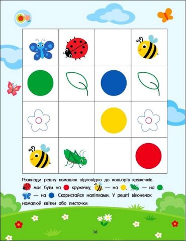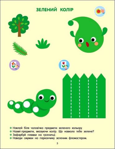 Усі кольори веселки й форми можна весело вивчати із зошитом "Колір та форма". На кожній сторінці усміхаються кумедні кольорові крапельки та барвасті форми. А серед них завдання: обведи пальчиком, розфарбуй, назви, знайди, покажи, наклей наліпку, доповни картинку. А що ще тут: роботи, монстрики, кульбабка, хмаринка та судоку. Позначки біля кожного завдання підкажуть, що потрібно робити. Так дитина максимально з користю пройде всі завдання та легко називатиме і відрізнятиме кольори. Розповість як живе колір у природі та речах. Якими бувають форми і фігури та як вони називаються. Як з кольору і форми складати картинки. Як визначити і сказати, якої форми предмет. І навіть, як орієнтуватися в таблиці. Зробіть ваше перше знайомство із кольором та формою барвистим разом із зошитом "Колір та форма". А щоб заняття були ще цікавишими, прочитайте поради на звороті зошита.
