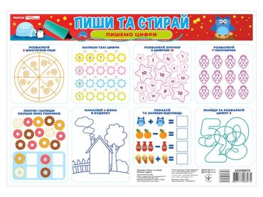 Наочність допоможе дітям розвивати навички у написанні цифр. Окрім цього на другій стороні подан0 8 цікавих завдань до виконання, а саме: