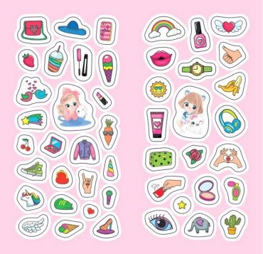Кожна розмальовка декорована блискітками, яку можемо доповнити яскравими наліпками з цього комплекту.