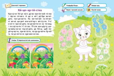 Кожен розворот книжки «Киця» — то цікава пригода, під час якої дитина прочитає історію, розфарбує її головного героя, наведе по пунктиру елементи, виріже й приклеїть частини малюнка, доповнить його тематичними наліпками, а також виконає завдання з математики, читання, логіки тощо. Ігрове дозвілля допоможе не лише створити маленькі шедеври власноруч, а й покращить навички читання, потренує пам’ять та увагу, розвине логічне мислення та уяву, розширить словниковий запас і поліпшить дрібну моторику пальців рук.