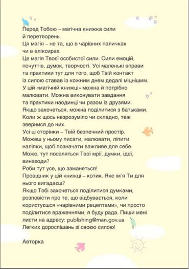 Українська дитяча та сімейна психологиня Світлана Ройз разом із мудрим кмітливим котом пропонує дітям, а також їхнім рідним дорослим зануритися в безпечний простір видання, яке допоможе розкривати, плекати й відновлювати внутрішню силу, стійкість, розуміти власні емоції, довіряти їм і своєму внутрішньому світу. Ви навіть станете співавтором книжки, адже формат воркбука передбачає малювання та писання прямо на сторінках. Водночас пізнавальна, розвиваюча, розважальна художня книжка містить дотепні та грайливі вправи й практики, а ще кумедні наліпки від головного героя – помічника читак.