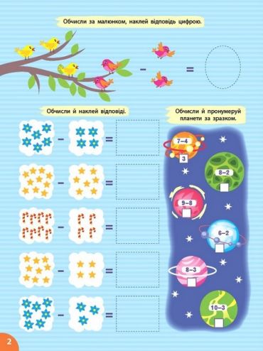 На сторінках книжки «Математика. Віднімання» дитина потренується обчислювати приклади на віднімання в межах 20, записувати числові вирази за малюнками та ілюструвати приклади. Видання містить цікаві ігрові завдання, виконання яких потребує використання наліпок, малювання чи запис відповідей, що розвине дрібну моторику, потренує пам’ять та уяву, розвине логічне мислення та увагу. Прості завдання в цікавому оформленні стимулюватимуть до пізнання і вивчення матеріалу, необхідного для дошкільняти.