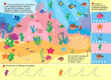 Яскрава книжка-гра «Знайди мене. В океані» допоможе дитині пригадати мешканців океану, упізнати їх за особливими зовнішніми прикметами й наклеїти зображення кожного повністю. На кожній сторінці є додаткові цікаві завдання, у яких потрібно знайти й полічити різні елементи, відгадати тематичні загадки й навести пунктирні лінії-доріжки. Дрібні наліпки допоможуть розвинути фантазію і креативність.