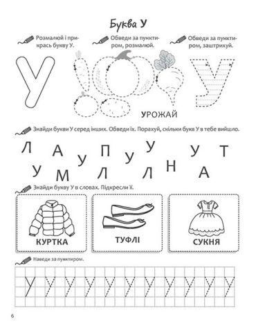 Завдяки посібнику «Вивчаємо літери. Річний курс завдань» дитина навчиться впізнавати і називати букви української абетки, а також отримає додаткові навички, а саме: сформує вміння виокремлювати перший і останній звуки у словах, підбирати слова на заданий звук, знаходити місце звука у словах, читати двобуквені склади і свої перші слова, складати за допомогою дорослих описові висловлювання, власні та сюжетні розповіді за змістом малюнків та за уявою. Закріпить навички утримувати олівець або фломастер, навчиться орієнтуватися на сторінці зошита та відпрацює початкові графічні навички, збагатить свій словниковий запас.