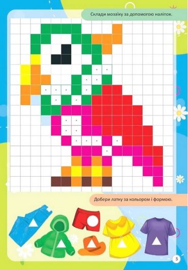Яскрава, захоплива книжка з наліпками познайомить дитину з основними кольорами та формами. Пазли, лабіринти, розмальовки, мозаїка… На кожній сторінці завдання, від яких дитина буде в захваті!