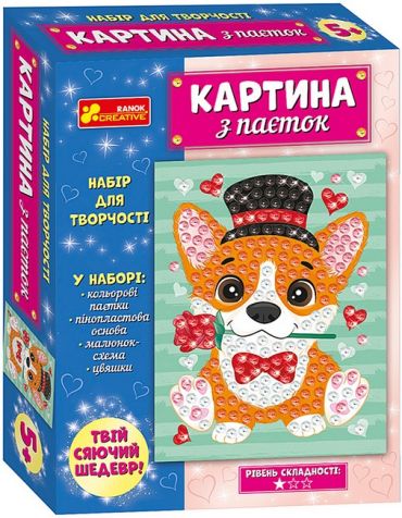Усі складові містяться у наборі: кольорові паєтки, цвяшки, кольорова схема, основа з пінопласту, детальна інструкція. - АвторРанок-Креатив