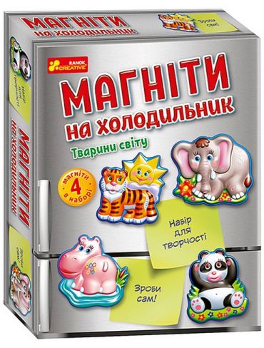 За допомогою нашого набору робимо 4 яскравих та барвистих магніти на холодильник.