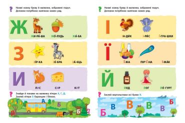 Ця книжка допоможе малюку вивчити всі букви алфавіту: на її сторінках дитина матиме змогу запам’ятати, як вони пишуться та вимовляються. Яскраві ілюстрації та поділені на склади слова полегшать процес читання, а завдання з наліпками допоможуть відпрацювати й закріпити навички.