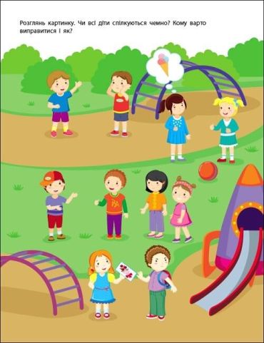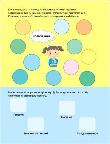 Вивчайте правила поведінки з виховною серією та улюбленим заняттям дітей. «Правила спілкування» — стікербук з ігровими вправами, що має понад 50 наліпок. Для того, щоб закінчити малюнок, дитині потрібно відповісти на питання. А потім приклеїти наліпки за сюжетом. Так дитина вчиться етиці поведінки, досліджує правила ввічливого поводження, формує звички бути охайною, чуйною і турботливою. А ще розвиває увагу, тренується орієнтуватися у просторі й сприймати на слух інформацію. І як же виховна серія без золотих правил поведінки? Ви їх знайдите на звороті обкладинки.