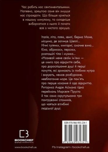 Час робить нас сентиментальними. Напевно, зрештою саме він змушує нас страждати. Що більше криється в нашому минулому, то складніше виборсатися з нього й почати все з чистого аркуша. Італія, літо, пляж, хвилі, берма Моне, місцина, де загинув Шеллі… Нічні гулянки, книгарні, смачне вино… Кіно, абрикоси, персики, розпашілі тіла і музика… «Називай мене своїм ім’ям» — це книга про відкриття себе, про дорослішання душі й перші почуття, які зринають з глибина нутра і вирують, немов розбурхане, невблаганне море. Це пам’ять про перше кохання й ода відкриттю. Риторика Андре Асімана гідна переймань Марселя Пруста й так само скрупульозна при пантруванні споминів, що чаяться вглибині людської душі.