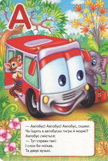 Дивовижну історію розповідає нам літера «А»: автобусом їздять не лише діти, а й тигри, моржі та навіть... слони, якщо зможуть упхатися всередину.
