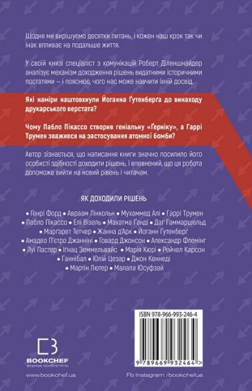 Щодня ми вирішуємо десятки питань, і кожен наш крок так чи інак впливає на подальше життя. У своїй книзі спеціаліст з комунікацій Роберт Діленшнайдер аналізує механізм доходження рішень видатними історичними постатями — і пояснює, чого нас може навчити їхній досвід. Які наміри наштовхнули Йоганна Ґутенберґа до винаходу друкарського верстата? Чому Пабло Пікассо створив геніальну «Ґерніку», а Гаррі Трумен зважився на застосування атомної бомби? Автор зізнається, що написання книги значно посилило його особисті здібності доходити рішень, і впевнений, що ця робота допоможе вийти на новий рівень і читачам.