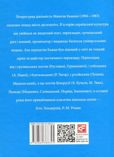 Літературна діяльність Миколи Бажана (1904—1983) охоплює понад шість десятиліть. В історію української культури він увійшов як видатний поет, перекладач, громадський діяч і вчений, організатор і видавець багатьох універсальних видань, серед яких, наприклад, Українська Енциклопедія, яка довгий час носила його ім’я. Можна сказати, що він був обласканий владою, свідчення тому — нагороди та посади, які він обіймав. Але, передусім, Бажан був відомий у світі як тоний лірик та майстер поетичного перекладу. Перекладав він і грузинських поетів (Руставелі, Гурамішвілі), і узбецьких (А. Навої), і бенгальських (Р. Тагор), і російських (Пушкін, Маяковський), а ще поетів Білорусії (Я. Купала, М. Танк), Польщі (Міцкевич, Словацький, Норвід, Івашкевич), в останні роки його приваблювала класична німецька поезія — Гете, Гельдерлін, Р.-М. Рільке.. Переклад Бажаном «Витязя в тигровій шкурі» Руставелі в Грузії вважають найдосконалішим у слов’янських літературах.