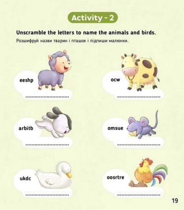 Тут Бреді знайомить діток з домашніми тваринами, які живуть у будинку та на подвір’ї. Котик, собачка, корова, папуга — ось скільки нових слів ви вивчете разом з малечею. Багато уваги у книжечці приділяється саме практичній частині. Купа цікавих завдань, які у формі гри допоможуть малечі закріпити знання.