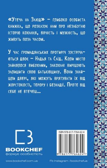 Утеча на Захід — глибоко особиста книга, в якій ідеться про незабутню історію кохання, вірність та мужність, що існує поза часом. У час громадянських протиріч зустрічаються двоє — Надья та Саїд. Коли місто зайнялося вибухами, закохані вирішують залишити свою батьківщину. Вони знайшли двері, які можуть врятувати їх від жорстокості, терору та безнадії. Проте від себе не втечеш…