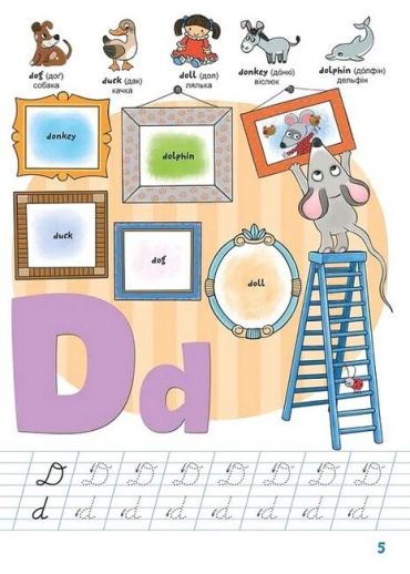 За допомогою книги діти залюбки вчитимуть англійські літери та слова, навчатимуться писати - все це у формі гри. Книга містить 100 наліпок для виконання завдань.