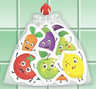 Фігурки змочують водою (кидають в ванну, в тазик, під краном), після цього вони прекрасно утримуються на гладкій поверхні ванни, плитки, дзеркалі. Дитина купається і вивчає фрукти та овочі. Потім фігурки збираються в мішечок для просушування.