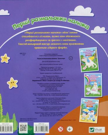 «Перші розмальовки малюка» обов’язково сподобаються дітлахам, адже вони обожнюють розфарбовувати та гратися з наліпками. Товстий кольоровий контур дозволить юним художникам правильно дібрати фарби.