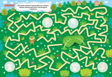 Разом з ним вони подорожуватимуть фруктовим містом, милуватимуться квітками латаття, збиратимуть мушлі, шукаючи правильний шлях у кожному лабіринті. Яскраві малюнки, великі наліпки та цікаві завдання допоможуть малюкам розвинути увагу, логічне мислення, фантазію та дрібну моторику пальців рук.