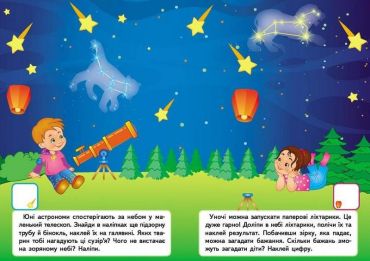 Чим захоплюється ваш малюк?Що його зацікавлює над усе?.. Малювання, історії про космічні мандрівки? Чи він любить майструвати що-небудь своїми руками, наприклад, шпаківню?А може, спостерігати за пташками у дворі чи бджілками на дідусевій пасіці?Але ж захоплюватися теж потрібно вміти! Це дуже важлива наука. Вона лежить в основі раннього активного розвитку мислення і творчих навичок.Наліпки для розвитку малюка — це одне з класних, корисних, цікавих захоплень, що розвивають уважність, кругозір, уяву і навички логічного мислення.62 наліпки допоможуть:придумати на «мольберті» свій оригінальний малюнок; чи «створити» власну галявинку для себе — з лісовими дзвіночками, барвистими метеликами й бабками; спостерігати за сузір’ями в Сонячній системі; доглядати за соковитими й корисними овочами на своєму (!) городі; та навіть збирати мед зі своєї пасіки і дружити з мурашками й сонечками.