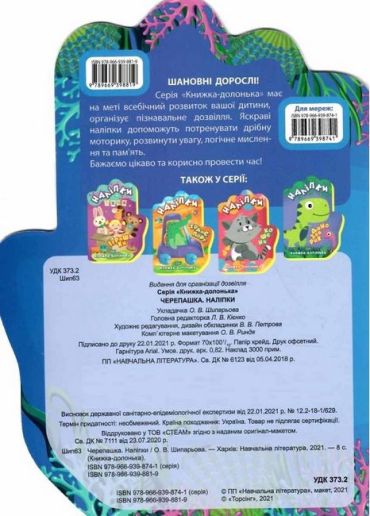 Серія «Книжка-долонька» має на меті всебічний розвиток вашої дитини, організує пізнавальне дозвілля. Яскраві наліпки допоможуть потренувати дрібну моторику, розвинути увагу, логічне мислення та пам'ять. Бажаємо цікаво та корисно провести час!