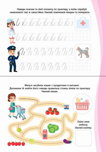 Це видання містить прописи по клітинках і лабіринти для дітей, розділені між собою для зручності роботи. У верхній частині зошита дітлахам потрібно навести лінії спочатку по пунктиру, а продовжити — самостійно, а в нижній — пройти лабіринти, які відповідають кругозору дітей: допомогти персонажам вибрати правильні стежки з декількох запропонованих, провести їх стежками з певних геометричних фігур тощо. Під час виконання завдань дітям стануть у пригоді яскраві наліпки, а оцінити свою роботу можна спеціальними наліпками-оцінками. Працюючи з виданням, малюк розвине дрібну моторику пальців рук, просторове мислення, уміння орієнтуватися на аркуші паперу, а також підготує руку до письма.
