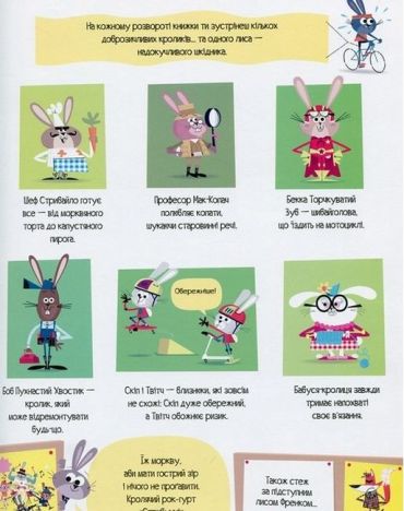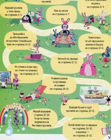 Книжка, яка поєднує найцікавіші заняття для дітей: вімельбух, наліпки та головоломки. На кожному розвороті зображена яскрава, насичена деталями сцена з життя Кролячого королівства: підземні лабіринти нірок-домівок, Олімпійські ігри, туристичний похід і мегапопулярна вистава за участю вухастих артистів. Герої-кролики складуть читачам компанію під час подорожі й запропонують безліч пошукових завдань, які вимагають уважності та спостережливості. А наприкінці мандрівки запросять на пікнік і влаштують захопливі ігри з наліпками.