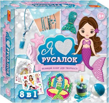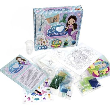 Створюємо 8 творчих поробок власноруч! !Упакування з 3D тисненням! Великий набір для творчості!Чудовий подарунок до свят! Запрошуємо тебе у світ натхнення і загадкових чарівних русалок!! За допомогою цього набору діти зможуть самостійно зробити гелеву свічку, бомбочку для ванн, картину-магніт з блискучою мозаїкою, флакончик-кулон, браслети дружби, брошку з фетру. А ще в цьому великому наборі для творчості є релакс-розмальовка і яскраві наліпки! У наборі є все необхідне для створення творчих поробок.