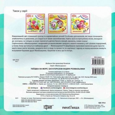Навколишній світ сповнений пригод та надзвичайних речей! Особливо для малюків, які лише починають знайомитись із довкіллям, усе видається таким захоплюючим. Навіть проста прогулянка лісом, екскурсія до зоопарку чи поїздка на море принесуть дитині багато емоцій, вражень, нових знань! Серія книжок «Малюшарики» з водяними розмальовками занурить вашого малюка у світ цікавих подорожей, у якому йому зустрінуться найкращі друзі — Малюшарики! Розфарбувати приховані малюнки дуже просто: варто лише взяти пензлик, занурити його у воду та провести по картинці. І одразу ж перед малюком оживуть яскравими барвами друзі-Малюшарики, тваринки та все, що їх оточує.