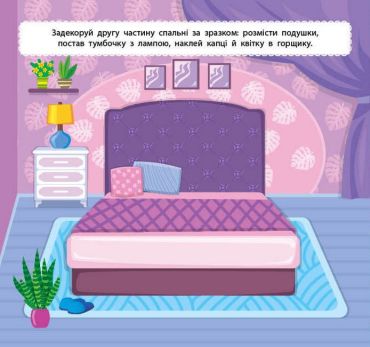 Разом із цією книжкою дитина відчує себе справжнім декоратором і зможе за допомогою наліпок втілити в життя своє бачення дизайну будинку. На сторінках книжки малюк розставить меблі в передпокої, оздобить екзотичними квітами, фото й посудом вітальню та їдальню, прикрасить цікавими іграшками та неймовірними декораціями спальні, зробить зручною ванну кімнату та затишно облаштує галерею.