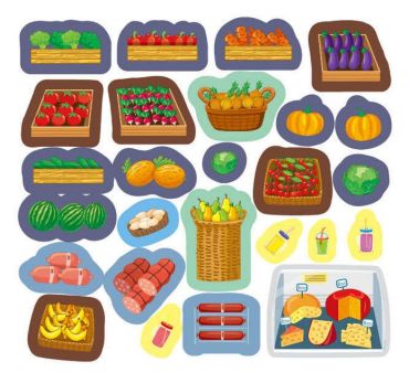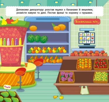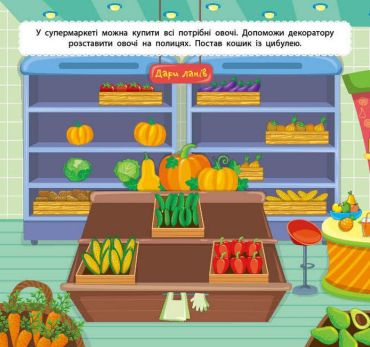 Разом із цією книжкою дитина відчує себе справжнім декоратором і зможе за допомогою наліпок втілити в життя своє бачення дизайну супермаркету. На сторінках книжки малюк розставить ящики з яскравими овочами та фруктами, розмістить у холодильниках різноманітні ковбаси та сири, розкладе по полицях запашний хліб, задекорує вітрини з одягом і валізами, оздобить на свій смак відділ із солодощами й іграшками, облаштує зону відпочинку для дорослих і дітей.
