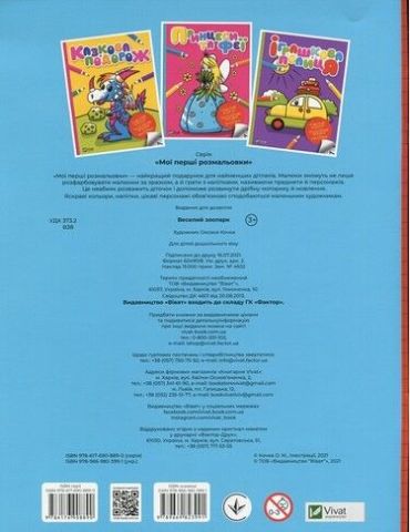 "Мої перші розмальовки"-найкращий подарунок для найменших дітлахів. Малюки зможуть не лише розфарбувати малюнки за зразком, а й грати з наліпками, називаючи предмети й персонажів. Це неабияк розважить діточок і допоможе розвинути дрібну моторику й мовлення. Яскраві кольори,наліпки,цікаві персонажі обов'язково сподобаються маленьким художникам.