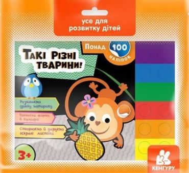 Такі різні тварини Понад 100 наліпок 3+ Кенгуру Ранок. Набір містить 8 шаблонів для створення листівок та 2 аркуші з наліпками різної форми. Дітям пропонується дібрати наліпки відповідного кольору та прикрасити ними листівки.